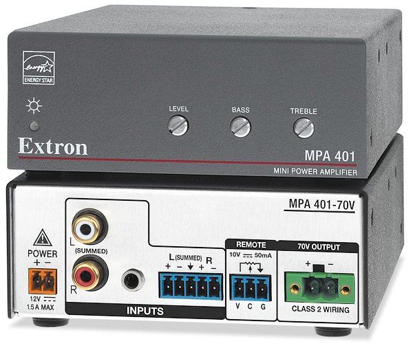 Mono 70 / 100 V Power Amplifier - 40 Watts 70 Volt mono amplifer with 40 watts output Balanced and unbalanced buffered audio inputs (RCA / 3.5mm / terminal block) Front panel bass, treble, and input level inputs Rack mountable with optional RSU 126 rack shelf (1 RU) Fanless design (no cooling required) Auto power-down and fast power-up Remote volume / mute control
